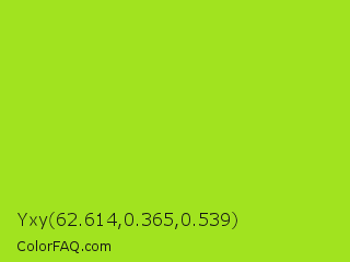 Yxy 62.614,0.365,0.539 Color is a normal green color and the nearest color is Inch Worm #b0e313. Hex code #a1e31f and RGB value is rgb(161,227,31). In RGB color space, this color is composed of 63% red, 89% green, 12% blue, In CMYK color space, this color is composed of 29% cyan, 0% magenta, 86% yellow , 11% black , In HSL color space, this color has a hue angle of 80° , 78% saturation and 51% lightness.