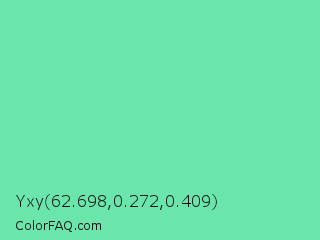 Yxy 62.698,0.272,0.409 Color is a light green color and the nearest color is Medium Aquamarine #66ddaa. Hex code #6ae6ac and RGB value is rgb(106,230,172). In RGB color space, this color is composed of 42% red, 90% green, 67% blue, In CMYK color space, this color is composed of 54% cyan, 0% magenta, 25% yellow , 10% black , In HSL color space, this color has a hue angle of 152° , 71% saturation and 66% lightness.