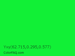Yxy 62.715,0.295,0.577 Color is a normal green color and the nearest color is Malachite #0bda51. Hex code #11f036 and RGB value is rgb(17,240,54). In RGB color space, this color is composed of 7% red, 94% green, 21% blue, In CMYK color space, this color is composed of 93% cyan, 0% magenta, 78% yellow , 6% black , In HSL color space, this color has a hue angle of 130° , 88% saturation and 50% lightness.