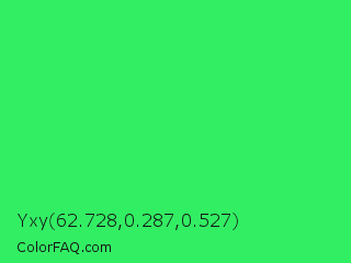 Yxy 62.728,0.287,0.527 Color is a normal green color and the nearest color is UFO Green #3cd070. Hex code #32ee63 and RGB value is rgb(50,238,99). In RGB color space, this color is composed of 20% red, 93% green, 39% blue, In CMYK color space, this color is composed of 79% cyan, 0% magenta, 58% yellow , 7% black , In HSL color space, this color has a hue angle of 136° , 85% saturation and 56% lightness.