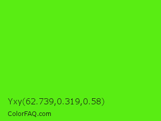Yxy 62.739,0.319,0.58 Color is a normal green color and the nearest color is Bright Green #66ff00. Hex code #59ed13 and RGB value is rgb(89,237,19). In RGB color space, this color is composed of 35% red, 93% green, 7% blue, In CMYK color space, this color is composed of 62% cyan, 0% magenta, 92% yellow , 7% black , In HSL color space, this color has a hue angle of 101° , 86% saturation and 50% lightness.