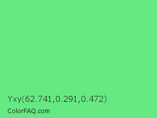 Yxy 62.741,0.291,0.472 Color is a light green color and the nearest color is Very Light Malachite Green #64e986. Hex code #66e983 and RGB value is rgb(102,233,131). In RGB color space, this color is composed of 40% red, 91% green, 51% blue, In CMYK color space, this color is composed of 56% cyan, 0% magenta, 44% yellow , 9% black , In HSL color space, this color has a hue angle of 133° , 75% saturation and 66% lightness.