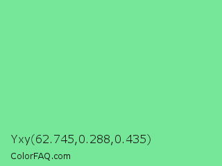 Yxy 62.745,0.288,0.435 Color is a light green color and the nearest color is Medium Aquamarine #66ddaa. Hex code #76e699 and RGB value is rgb(118,230,153). In RGB color space, this color is composed of 46% red, 90% green, 60% blue, In CMYK color space, this color is composed of 49% cyan, 0% magenta, 33% yellow , 10% black , In HSL color space, this color has a hue angle of 139° , 69% saturation and 68% lightness.