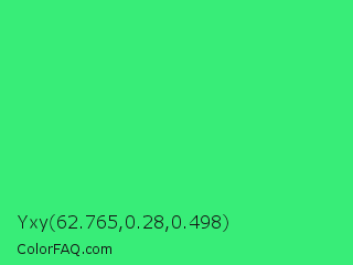 Yxy 62.765,0.28,0.498 Color is a normal green color and the nearest color is UFO Green #3cd070. Hex code #38ed78 and RGB value is rgb(56,237,120). In RGB color space, this color is composed of 22% red, 93% green, 47% blue, In CMYK color space, this color is composed of 76% cyan, 0% magenta, 49% yellow , 7% black , In HSL color space, this color has a hue angle of 141° , 83% saturation and 57% lightness.