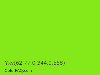Yxy 62.77,0.344,0.558 Color is a normal green color and the nearest color is Alien Armpit #84de02. Hex code #85e819 and RGB value is rgb(133,232,25). In RGB color space, this color is composed of 52% red, 91% green, 10% blue, In CMYK color space, this color is composed of 43% cyan, 0% magenta, 89% yellow , 9% black , In HSL color space, this color has a hue angle of 89° , 82% saturation and 50% lightness.