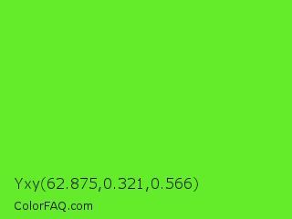 Yxy 62.875,0.321,0.566 Color is a normal green color and the nearest color is Spring Frost #87ff2a. Hex code #64ec2b and RGB value is rgb(100,236,43). In RGB color space, this color is composed of 39% red, 93% green, 17% blue, In CMYK color space, this color is composed of 58% cyan, 0% magenta, 82% yellow , 7% black , In HSL color space, this color has a hue angle of 102° , 84% saturation and 55% lightness.