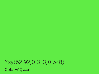 Yxy 62.92,0.313,0.548 Color is a normal green color and the nearest color is Screamin Green #66ff66. Hex code #60ec45 and RGB value is rgb(96,236,69). In RGB color space, this color is composed of 38% red, 93% green, 27% blue, In CMYK color space, this color is composed of 59% cyan, 0% magenta, 71% yellow , 7% black , In HSL color space, this color has a hue angle of 110° , 81% saturation and 60% lightness.