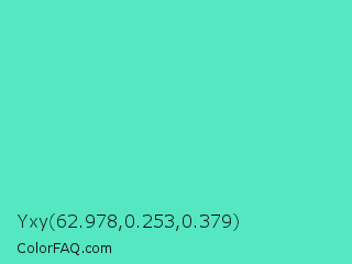 Yxy 62.978,0.253,0.379 Color is a light cyan color and the nearest color is Turquoise #40e0d0. Hex code #54e7c2 and RGB value is rgb(84,231,194). In RGB color space, this color is composed of 33% red, 91% green, 76% blue, In CMYK color space, this color is composed of 64% cyan, 0% magenta, 16% yellow , 9% black , In HSL color space, this color has a hue angle of 165° , 75% saturation and 62% lightness.