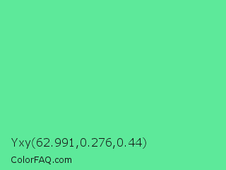 Yxy 62.991,0.276,0.44 Color is a light green color and the nearest color is Very Light Malachite Green #64e986. Hex code #5de99a and RGB value is rgb(93,233,154). In RGB color space, this color is composed of 36% red, 91% green, 60% blue, In CMYK color space, this color is composed of 60% cyan, 0% magenta, 34% yellow , 9% black , In HSL color space, this color has a hue angle of 146° , 76% saturation and 64% lightness.