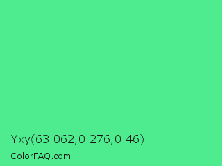 Yxy 63.062,0.276,0.46 Color is a light green color and the nearest color is Very Light Malachite Green #64e986. Hex code #4eeb8f and RGB value is rgb(78,235,143). In RGB color space, this color is composed of 31% red, 92% green, 56% blue, In CMYK color space, this color is composed of 67% cyan, 0% magenta, 39% yellow , 8% black , In HSL color space, this color has a hue angle of 145° , 80% saturation and 61% lightness.
