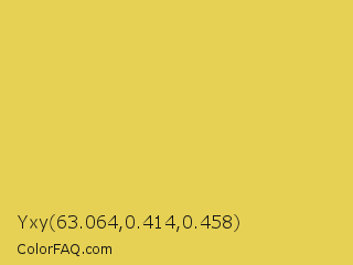 Yxy 63.064,0.414,0.458 Color is a light yellow color and the nearest color is Confetti #e9d75a. Hex code #e6d154 and RGB value is rgb(230,209,84). In RGB color space, this color is composed of 90% red, 82% green, 33% blue, In CMYK color space, this color is composed of 0% cyan, 9% magenta, 63% yellow , 10% black , In HSL color space, this color has a hue angle of 51° , 74% saturation and 62% lightness.
