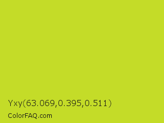 Yxy 63.069,0.395,0.511 Color is a normal yellow color and the nearest color is Pear #d1e231. Hex code #c4dc28 and RGB value is rgb(196,220,40). In RGB color space, this color is composed of 77% red, 86% green, 16% blue, In CMYK color space, this color is composed of 11% cyan, 0% magenta, 82% yellow , 14% black , In HSL color space, this color has a hue angle of 68° , 72% saturation and 51% lightness.