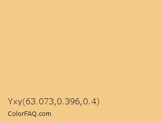 Yxy 63.073,0.396,0.4 Color is a light orange color and the nearest color is Chardonnay #ffcd8c. Hex code #f3ca88 and RGB value is rgb(243,202,136). In RGB color space, this color is composed of 95% red, 79% green, 53% blue, In CMYK color space, this color is composed of 0% cyan, 17% magenta, 44% yellow , 5% black , In HSL color space, this color has a hue angle of 37° , 82% saturation and 74% lightness.