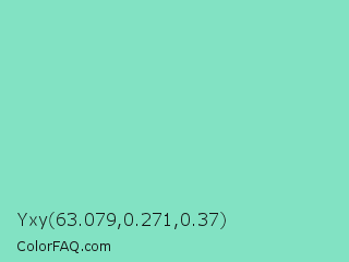 Yxy 63.079,0.271,0.37 Color is a light green color and the nearest color is Bermuda #7dd8c6. Hex code #82e2c3 and RGB value is rgb(130,226,195). In RGB color space, this color is composed of 51% red, 89% green, 76% blue, In CMYK color space, this color is composed of 42% cyan, 0% magenta, 14% yellow , 11% black , In HSL color space, this color has a hue angle of 161° , 62% saturation and 70% lightness.