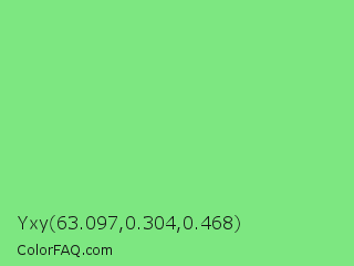 Yxy 63.097,0.304,0.468 Color is a light green color and the nearest color is Pastel Green #77dd77. Hex code #7de781 and RGB value is rgb(125,231,129). In RGB color space, this color is composed of 49% red, 91% green, 51% blue, In CMYK color space, this color is composed of 46% cyan, 0% magenta, 44% yellow , 9% black , In HSL color space, this color has a hue angle of 122° , 69% saturation and 70% lightness.