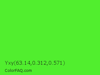 Yxy 63.14,0.312,0.571 Color is a normal green color and the nearest color is Neon Green #39ff14. Hex code #51ee2e and RGB value is rgb(81,238,46). In RGB color space, this color is composed of 32% red, 93% green, 18% blue, In CMYK color space, this color is composed of 66% cyan, 0% magenta, 81% yellow , 7% black , In HSL color space, this color has a hue angle of 109° , 85% saturation and 56% lightness.