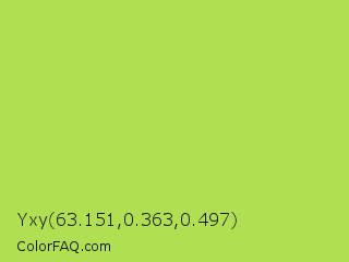 Yxy 63.151,0.363,0.497 Color is a normal green color and the nearest color is Conifer #acdd4d. Hex code #b0e052 and RGB value is rgb(176,224,82). In RGB color space, this color is composed of 69% red, 88% green, 32% blue, In CMYK color space, this color is composed of 21% cyan, 0% magenta, 63% yellow , 12% black , In HSL color space, this color has a hue angle of 80° , 70% saturation and 60% lightness.