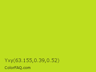 Yxy 63.155,0.39,0.52 Color is a normal yellow color and the nearest color is Fuego #bede0d. Hex code #bdde1e and RGB value is rgb(189,222,30). In RGB color space, this color is composed of 74% red, 87% green, 12% blue, In CMYK color space, this color is composed of 15% cyan, 0% magenta, 86% yellow , 13% black , In HSL color space, this color has a hue angle of 70° , 76% saturation and 49% lightness.