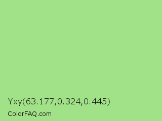 Yxy 63.177,0.324,0.445 Color is a light green color and the nearest color is Feijoa #9fdd8c. Hex code #a1e187 and RGB value is rgb(161,225,135). In RGB color space, this color is composed of 63% red, 88% green, 53% blue, In CMYK color space, this color is composed of 28% cyan, 0% magenta, 40% yellow , 12% black , In HSL color space, this color has a hue angle of 103° , 60% saturation and 71% lightness.