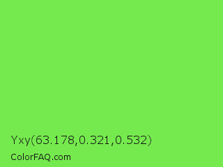 Yxy 63.178,0.321,0.532 Color is a light green color and the nearest color is Kiwi #8ee53f. Hex code #75ea4e and RGB value is rgb(117,234,78). In RGB color space, this color is composed of 46% red, 92% green, 31% blue, In CMYK color space, this color is composed of 50% cyan, 0% magenta, 67% yellow , 8% black , In HSL color space, this color has a hue angle of 105° , 79% saturation and 61% lightness.