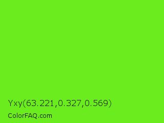 Yxy 63.221,0.327,0.569 Color is a normal green color and the nearest color is Spring Frost #87ff2a. Hex code #6bec1f and RGB value is rgb(107,236,31). In RGB color space, this color is composed of 42% red, 93% green, 12% blue, In CMYK color space, this color is composed of 55% cyan, 0% magenta, 87% yellow , 7% black , In HSL color space, this color has a hue angle of 98° , 84% saturation and 52% lightness.