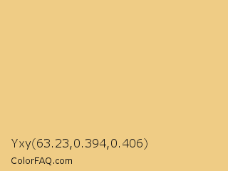 Yxy 63.23,0.394,0.406 Color is a light orange color and the nearest color is Putty #e7cd8c. Hex code #efcc85 and RGB value is rgb(239,204,133). In RGB color space, this color is composed of 94% red, 80% green, 52% blue, In CMYK color space, this color is composed of 0% cyan, 15% magenta, 44% yellow , 6% black , In HSL color space, this color has a hue angle of 40° , 77% saturation and 73% lightness.