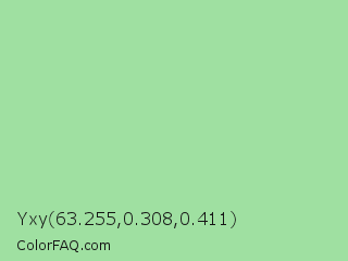 Yxy 63.255,0.308,0.411 Color is a light green color and the nearest color is Granny Smith Apple #a8e4a0. Hex code #9fe0a1 and RGB value is rgb(159,224,161). In RGB color space, this color is composed of 62% red, 88% green, 63% blue, In CMYK color space, this color is composed of 29% cyan, 0% magenta, 28% yellow , 12% black , In HSL color space, this color has a hue angle of 122° , 51% saturation and 75% lightness.