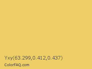 Yxy 63.299,0.412,0.437 Color is a light yellow color and the nearest color is Hansa Yellow #e9d66b. Hex code #eece67 and RGB value is rgb(238,206,103). In RGB color space, this color is composed of 93% red, 81% green, 40% blue, In CMYK color space, this color is composed of 0% cyan, 13% magenta, 57% yellow , 7% black , In HSL color space, this color has a hue angle of 46° , 80% saturation and 67% lightness.