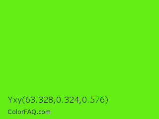 Yxy 63.328,0.324,0.576 Color is a normal green color and the nearest color is Bright Green #66ff00. Hex code #63ed14 and RGB value is rgb(99,237,20). In RGB color space, this color is composed of 39% red, 93% green, 8% blue, In CMYK color space, this color is composed of 58% cyan, 0% magenta, 92% yellow , 7% black , In HSL color space, this color has a hue angle of 98° , 86% saturation and 50% lightness.