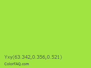 Yxy 63.342,0.356,0.521 Color is a normal green color and the nearest color is Conifer #acdd4d. Hex code #a1e441 and RGB value is rgb(161,228,65). In RGB color space, this color is composed of 63% red, 89% green, 25% blue, In CMYK color space, this color is composed of 29% cyan, 0% magenta, 71% yellow , 11% black , In HSL color space, this color has a hue angle of 85° , 75% saturation and 57% lightness.