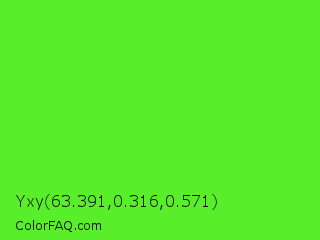 Yxy 63.391,0.316,0.571 Color is a normal green color and the nearest color is Neon Green #39ff14. Hex code #59ee2a and RGB value is rgb(89,238,42). In RGB color space, this color is composed of 35% red, 93% green, 16% blue, In CMYK color space, this color is composed of 63% cyan, 0% magenta, 82% yellow , 7% black , In HSL color space, this color has a hue angle of 106° , 85% saturation and 55% lightness.