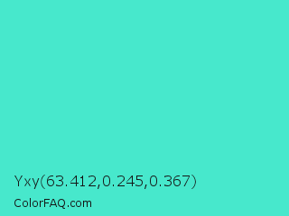 Yxy 63.412,0.245,0.367 Color is a normal cyan color and the nearest color is Turquoise #40e0d0. Hex code #47e8cc and RGB value is rgb(71,232,204). In RGB color space, this color is composed of 28% red, 91% green, 80% blue, In CMYK color space, this color is composed of 69% cyan, 0% magenta, 12% yellow , 9% black , In HSL color space, this color has a hue angle of 170° , 78% saturation and 59% lightness.
