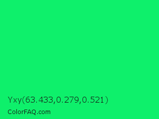 Yxy 63.433,0.279,0.521 Color is a normal green color and the nearest color is Spring Green #00ff7f. Hex code #0ef06b and RGB value is rgb(14,240,107). In RGB color space, this color is composed of 5% red, 94% green, 42% blue, In CMYK color space, this color is composed of 94% cyan, 0% magenta, 55% yellow , 6% black , In HSL color space, this color has a hue angle of 145° , 89% saturation and 50% lightness.