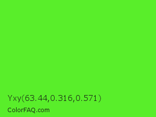 Yxy 63.44,0.316,0.571 Color is a normal green color and the nearest color is Neon Green #39ff14. Hex code #59ee2a and RGB value is rgb(89,238,42). In RGB color space, this color is composed of 35% red, 93% green, 16% blue, In CMYK color space, this color is composed of 63% cyan, 0% magenta, 82% yellow , 7% black , In HSL color space, this color has a hue angle of 106° , 85% saturation and 55% lightness.