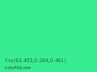 Yxy 63.453,0.269,0.461 Color is a normal green color and the nearest color is Eucalyptus #44d7a8. Hex code #38ed91 and RGB value is rgb(56,237,145). In RGB color space, this color is composed of 22% red, 93% green, 57% blue, In CMYK color space, this color is composed of 76% cyan, 0% magenta, 39% yellow , 7% black , In HSL color space, this color has a hue angle of 150° , 83% saturation and 57% lightness.