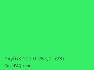 Yxy 63.505,0.287,0.523 Color is a normal green color and the nearest color is UFO Green #3cd070. Hex code #37ef66 and RGB value is rgb(55,239,102). In RGB color space, this color is composed of 22% red, 94% green, 40% blue, In CMYK color space, this color is composed of 77% cyan, 0% magenta, 57% yellow , 6% black , In HSL color space, this color has a hue angle of 135° , 85% saturation and 58% lightness.