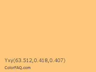 Yxy 63.512,0.418,0.407 Color is a light orange color and the nearest color is Topaz #ffc87c. Hex code #ffc77a and RGB value is rgb(255,199,122). In RGB color space, this color is composed of 100% red, 78% green, 48% blue, In CMYK color space, this color is composed of 0% cyan, 22% magenta, 52% yellow , 0% black , In HSL color space, this color has a hue angle of 35° , 100% saturation and 74% lightness.