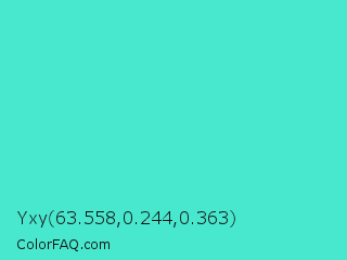 Yxy 63.558,0.244,0.363 Color is a normal cyan color and the nearest color is Turquoise #40e0d0. Hex code #48e8cf and RGB value is rgb(72,232,207). In RGB color space, this color is composed of 28% red, 91% green, 81% blue, In CMYK color space, this color is composed of 69% cyan, 0% magenta, 11% yellow , 9% black , In HSL color space, this color has a hue angle of 171° , 78% saturation and 60% lightness.