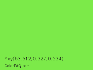 Yxy 63.612,0.327,0.534 Color is a normal green color and the nearest color is Kiwi #8ee53f. Hex code #7cea49 and RGB value is rgb(124,234,73). In RGB color space, this color is composed of 49% red, 92% green, 29% blue, In CMYK color space, this color is composed of 47% cyan, 0% magenta, 69% yellow , 8% black , In HSL color space, this color has a hue angle of 101° , 79% saturation and 60% lightness.