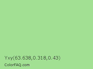 Yxy 63.638,0.318,0.43 Color is a light green color and the nearest color is Granny Smith Apple Crayola #9de093. Hex code #a2e193 and RGB value is rgb(162,225,147). In RGB color space, this color is composed of 64% red, 88% green, 58% blue, In CMYK color space, this color is composed of 28% cyan, 0% magenta, 35% yellow , 12% black , In HSL color space, this color has a hue angle of 108° , 57% saturation and 73% lightness.
