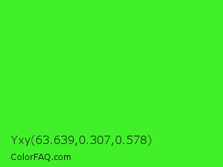 Yxy 63.639,0.307,0.578 Color is a normal green color and the nearest color is Neon Green #39ff14. Hex code #42f02a and RGB value is rgb(66,240,42). In RGB color space, this color is composed of 26% red, 94% green, 16% blue, In CMYK color space, this color is composed of 73% cyan, 0% magenta, 83% yellow , 6% black , In HSL color space, this color has a hue angle of 113° , 87% saturation and 55% lightness.