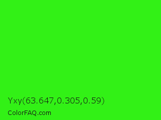 Yxy 63.647,0.305,0.59 Color is a normal green color and the nearest color is Neon Green #39ff14. Hex code #32f116 and RGB value is rgb(50,241,22). In RGB color space, this color is composed of 20% red, 95% green, 9% blue, In CMYK color space, this color is composed of 79% cyan, 0% magenta, 91% yellow , 5% black , In HSL color space, this color has a hue angle of 112° , 89% saturation and 52% lightness.