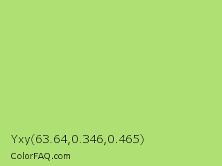 Yxy 63.64,0.346,0.465 Color is a light green color and the nearest color is Yellow Green #c5e17a. Hex code #afe073 and RGB value is rgb(175,224,115). In RGB color space, this color is composed of 69% red, 88% green, 45% blue, In CMYK color space, this color is composed of 22% cyan, 0% magenta, 49% yellow , 12% black , In HSL color space, this color has a hue angle of 87° , 64% saturation and 66% lightness.