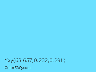 Yxy 63.657,0.232,0.291 Color is a light cyan color and the nearest color is Spray #79deec. Hex code #6be0ff and RGB value is rgb(107,224,255). In RGB color space, this color is composed of 42% red, 88% green, 100% blue, In CMYK color space, this color is composed of 58% cyan, 12% magenta, 0% yellow , 0% black , In HSL color space, this color has a hue angle of 193° , 100% saturation and 71% lightness.