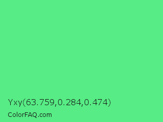Yxy 63.759,0.284,0.474 Color is a light green color and the nearest color is Very Light Malachite Green #64e986. Hex code #57ec85 and RGB value is rgb(87,236,133). In RGB color space, this color is composed of 34% red, 93% green, 52% blue, In CMYK color space, this color is composed of 63% cyan, 0% magenta, 44% yellow , 7% black , In HSL color space, this color has a hue angle of 139° , 80% saturation and 63% lightness.