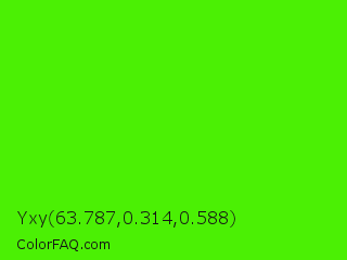 Yxy 63.787,0.314,0.588 Color is a normal green color and the nearest color is Chlorophyll Green #4aff00. Hex code #4bf004 and RGB value is rgb(75,240,4). In RGB color space, this color is composed of 29% red, 94% green, 2% blue, In CMYK color space, this color is composed of 69% cyan, 0% magenta, 98% yellow , 6% black , In HSL color space, this color has a hue angle of 102° , 97% saturation and 48% lightness.