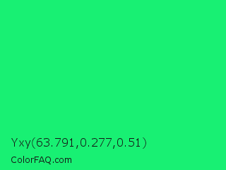 Yxy 63.791,0.277,0.51 Color is a normal green color and the nearest color is Spring Green #00ff7f. Hex code #18f073 and RGB value is rgb(24,240,115). In RGB color space, this color is composed of 9% red, 94% green, 45% blue, In CMYK color space, this color is composed of 90% cyan, 0% magenta, 52% yellow , 6% black , In HSL color space, this color has a hue angle of 145° , 88% saturation and 52% lightness.