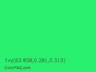 Yxy 63.858,0.281,0.515 Color is a normal green color and the nearest color is UFO Green #3cd070. Hex code #28f06e and RGB value is rgb(40,240,110). In RGB color space, this color is composed of 16% red, 94% green, 43% blue, In CMYK color space, this color is composed of 83% cyan, 0% magenta, 54% yellow , 6% black , In HSL color space, this color has a hue angle of 141° , 87% saturation and 55% lightness.