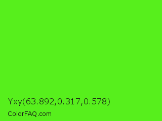 Yxy 63.892,0.317,0.578 Color is a normal green color and the nearest color is Chlorophyll Green #4aff00. Hex code #57ef1c and RGB value is rgb(87,239,28). In RGB color space, this color is composed of 34% red, 94% green, 11% blue, In CMYK color space, this color is composed of 64% cyan, 0% magenta, 88% yellow , 6% black , In HSL color space, this color has a hue angle of 103° , 87% saturation and 52% lightness.