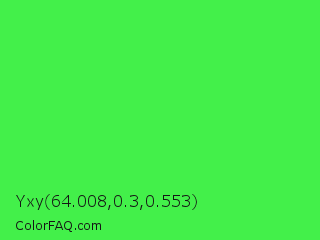 Yxy 64.008,0.3,0.553 Color is a normal green color and the nearest color is Lime Green #32cd32. Hex code #43f04a and RGB value is rgb(67,240,74). In RGB color space, this color is composed of 26% red, 94% green, 29% blue, In CMYK color space, this color is composed of 72% cyan, 0% magenta, 69% yellow , 6% black , In HSL color space, this color has a hue angle of 122° , 85% saturation and 60% lightness.